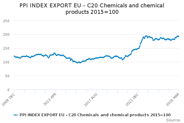 Download this time seriesPPI INDEX EXPORT EU - C20 Chemicals and chemical products 2015=100