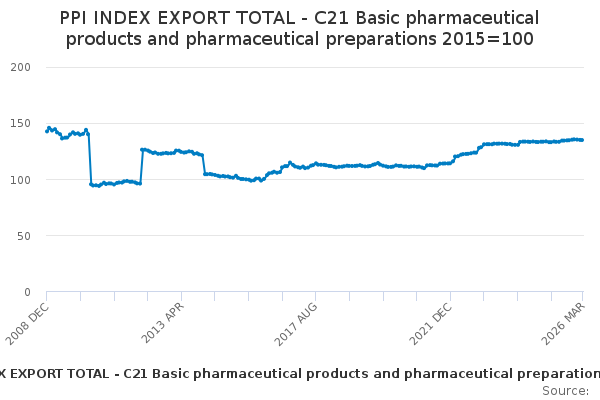 Download this time seriesPPI INDEX EXPORT TOTAL - C21 Basic pharmaceutical products and pharmaceutical preparations 2015=100