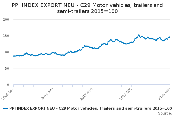 Download this time seriesPPI INDEX EXPORT NEU - C29 Motor vehicles, trailers and semi-trailers 2015=100