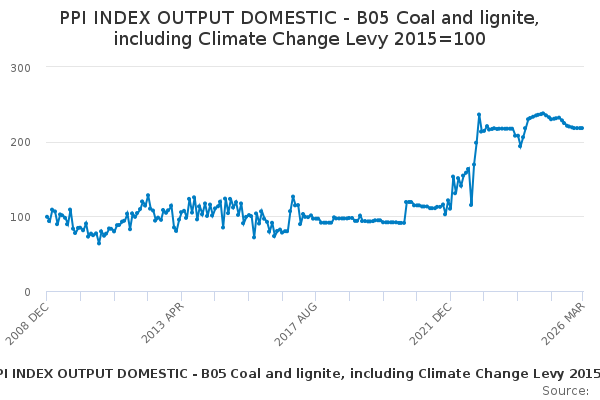 Download this time seriesPPI INDEX OUTPUT DOMESTIC - B05 Coal and lignite, including Climate Change Levy 2015=100