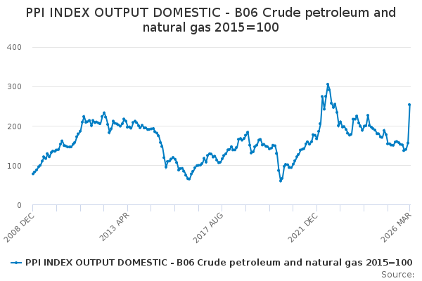 Download this time seriesPPI INDEX OUTPUT DOMESTIC - B06 Crude petroleum and natural gas 2015=100