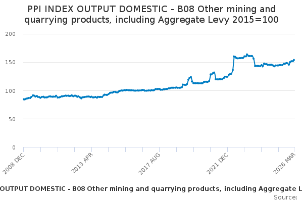Download this time seriesPPI INDEX OUTPUT DOMESTIC - B08 Other mining and quarrying products, including Aggregate Levy 2015=100