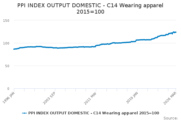 Download this time seriesPPI INDEX OUTPUT DOMESTIC - C14 Wearing apparel 2015=100