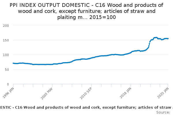 Download this time seriesPPI INDEX OUTPUT DOMESTIC - C16 Wood and products of wood and cork, except furniture; articles of straw and plaiting m... 2015=100