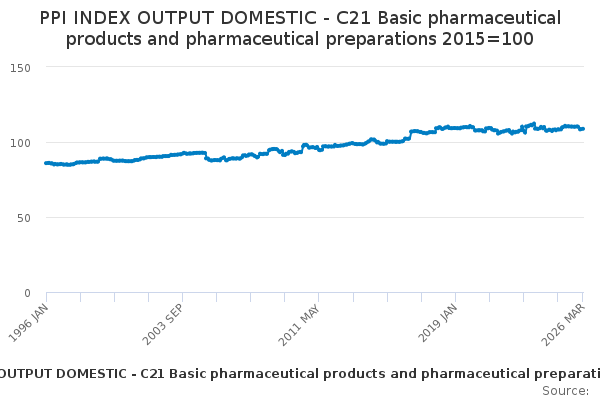 Download this time seriesPPI INDEX OUTPUT DOMESTIC - C21 Basic pharmaceutical products and pharmaceutical preparations 2015=100