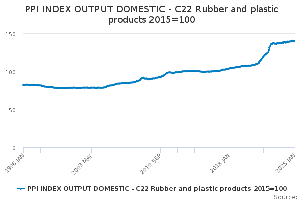 Download this time seriesPPI INDEX OUTPUT DOMESTIC - C22 Rubber and plastic products 2015=100