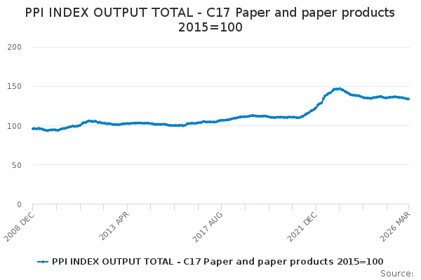 Download this time seriesPPI INDEX OUTPUT TOTAL - C17 Paper and paper products 2015=100