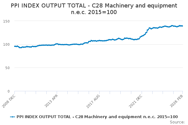 Download this time seriesPPI INDEX OUTPUT TOTAL - C28 Machinery and equipment n.e.c. 2015=100