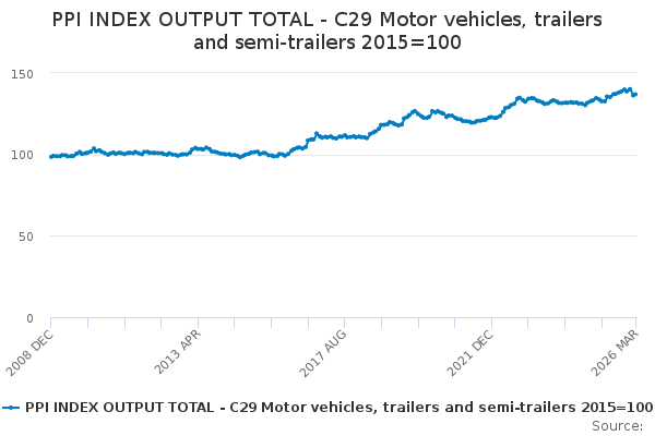 Download this time seriesPPI INDEX OUTPUT TOTAL - C29 Motor vehicles, trailers and semi-trailers 2015=100
