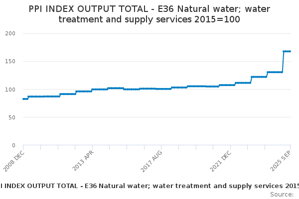 Download this time seriesPPI INDEX OUTPUT TOTAL - E36 Natural water; water treatment and supply services 2015=100