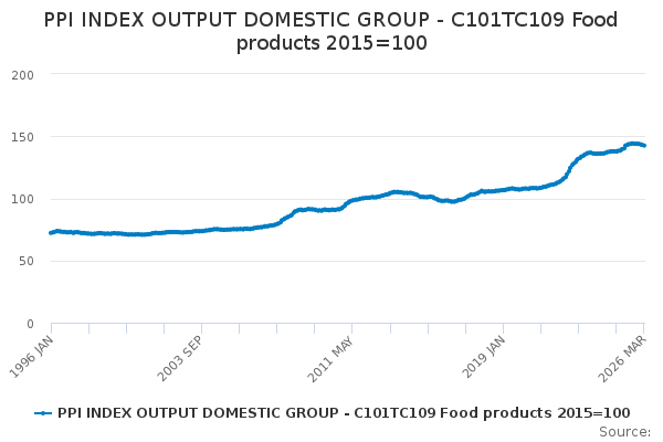 Download this time seriesPPI INDEX OUTPUT DOMESTIC GROUP - C101TC109 Food products 2015=100