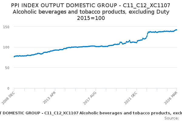 Download this time seriesPPI INDEX OUTPUT DOMESTIC GROUP - C11_C12_XC1107 Alcoholic beverages and tobacco products, excluding Duty 2015=100