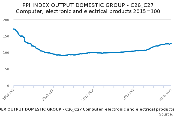 Download this time seriesPPI INDEX OUTPUT DOMESTIC GROUP - C26_C27 Computer, electronic and electrical products 2015=100