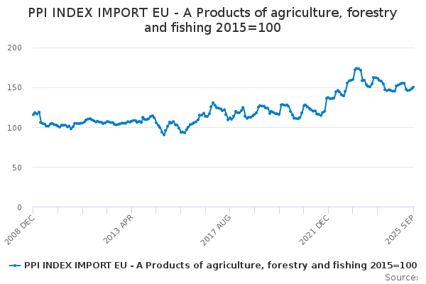 Download this time seriesPPI INDEX IMPORT EU - A Products of agriculture, forestry and fishing 2015=100