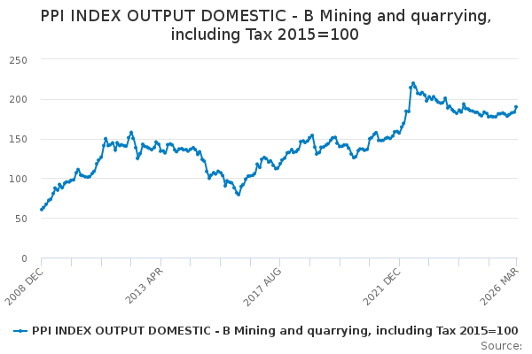 Download this time seriesPPI INDEX OUTPUT DOMESTIC - B Mining and quarrying, including Tax 2015=100