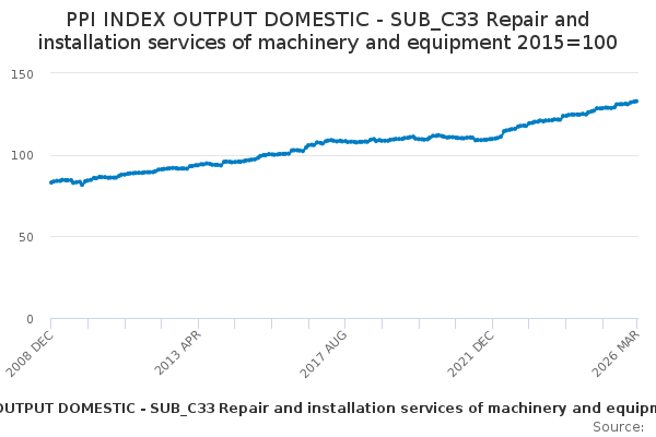Download this time seriesPPI INDEX OUTPUT DOMESTIC - SUB_C33 Repair and installation services of machinery and equipment 2015=100