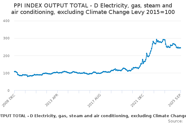 Download this time seriesPPI INDEX OUTPUT TOTAL - D Electricity, gas, steam and air conditioning, excluding Climate Change Levy 2015=100