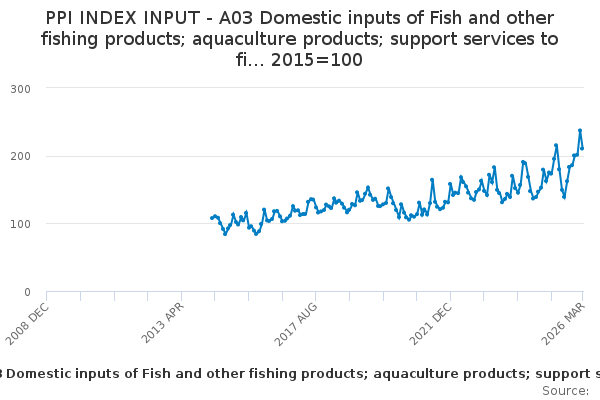 Download this time seriesPPI INDEX INPUT - A03 Domestic inputs of Fish and other fishing products; aquaculture products; support services to fi... 2015=100