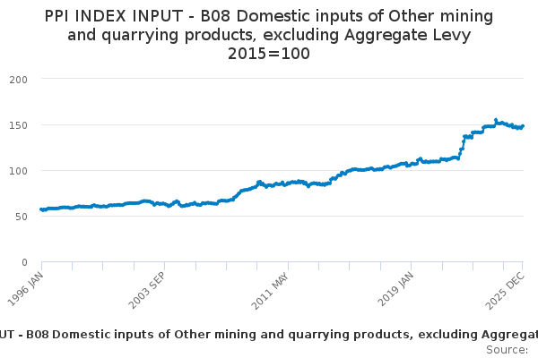 Download this time seriesPPI INDEX INPUT - B08 Domestic inputs of Other mining and quarrying products, excluding Aggregate Levy 2015=100