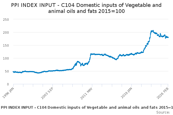 Download this time seriesPPI INDEX INPUT - C104 Domestic inputs of Vegetable and animal oils and fats 2015=100