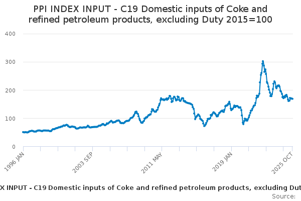 Download this time seriesPPI INDEX INPUT - C19 Domestic inputs of Coke and refined petroleum products, excluding Duty 2015=100