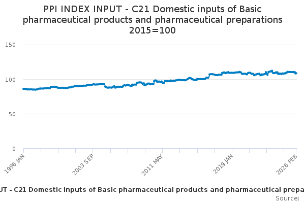 Download this time seriesPPI INDEX INPUT - C21 Domestic inputs of Basic pharmaceutical products and pharmaceutical preparations 2015=100