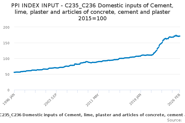 Download this time seriesPPI INDEX INPUT - C235_C236 Domestic inputs of Cement, lime, plaster and articles of concrete, cement and plaster 2015=100