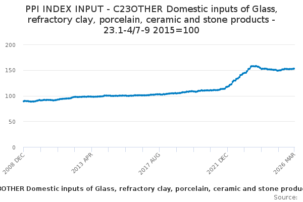 Download this time seriesPPI INDEX INPUT - C23OTHER Domestic inputs of Glass, refractory clay, porcelain, ceramic and stone products - 23.1-4/7-9 2015=100