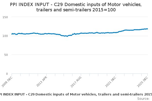 Download this time seriesPPI INDEX INPUT - C29 Domestic inputs of Motor vehicles, trailers and semi-trailers 2015=100