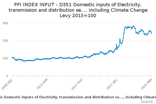 Download this time seriesPPI INDEX INPUT - D351 Domestic inputs of Electricity, transmission and distribution se..., including Climate Change Levy 2015=100
