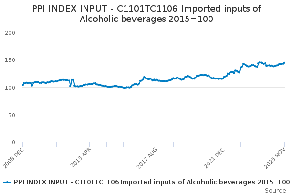 Download this time seriesPPI INDEX INPUT - C1101TC1106 Imported inputs of Alcoholic beverages 2015=100