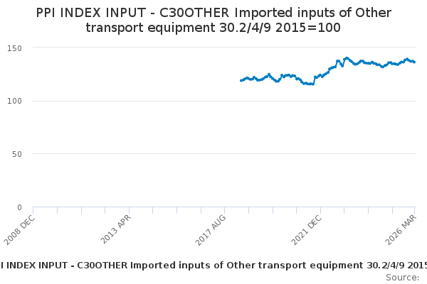 Download this time seriesPPI INDEX INPUT - C30OTHER Imported inputs of Other transport equipment 30.2/4/9 2015=100