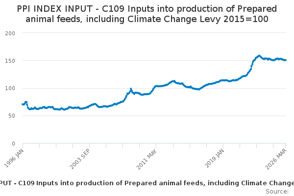 Download this time seriesPPI INDEX INPUT - C109 Inputs into production of Prepared animal feeds, including Climate Change Levy 2015=100