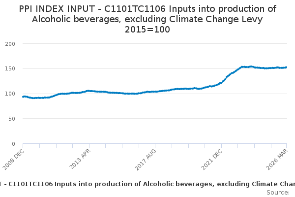 Download this time seriesPPI INDEX INPUT - C1101TC1106 Inputs into production of Alcoholic beverages, excluding Climate Change Levy 2015=100