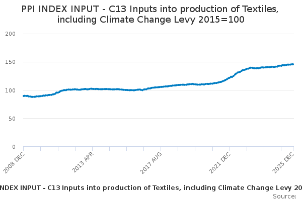 Download this time seriesPPI INDEX INPUT - C13 Inputs into production of Textiles, including Climate Change Levy 2015=100