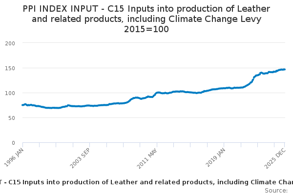 Download this time seriesPPI INDEX INPUT - C15 Inputs into production of Leather and related products, including Climate Change Levy 2015=100