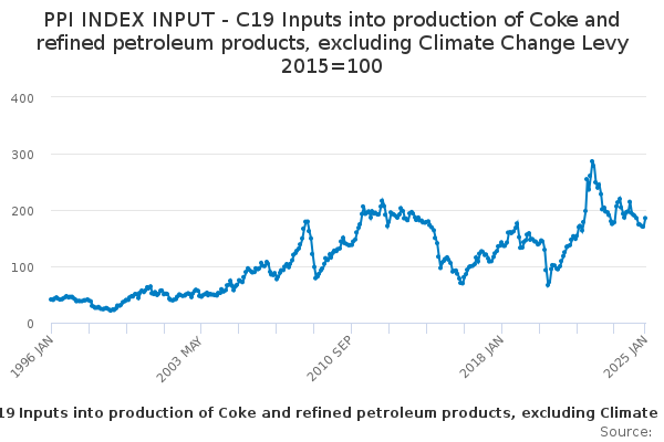 Download this time seriesPPI INDEX INPUT - C19 Inputs into production of Coke and refined petroleum products, excluding Climate Change Levy 2015=100