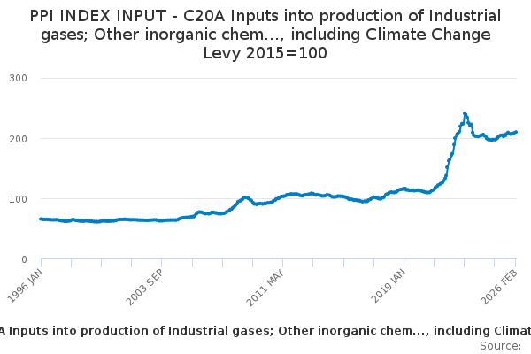 Download this time seriesPPI INDEX INPUT - C20A Inputs into production of Industrial gases; Other inorganic chem..., including Climate Change Levy 2015=100
