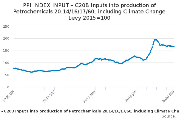 Download this time seriesPPI INDEX INPUT - C20B Inputs into production of Petrochemicals 20.14/16/17/60, including Climate Change Levy 2015=100