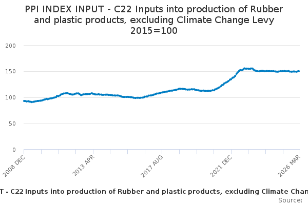 Download this time seriesPPI INDEX INPUT - C22 Inputs into production of Rubber and plastic products, excluding Climate Change Levy 2015=100