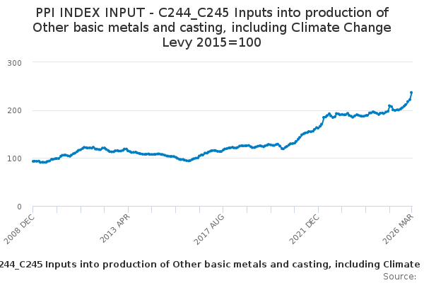 Download this time seriesPPI INDEX INPUT - C244_C245 Inputs into production of Other basic metals and casting, including Climate Change Levy 2015=100