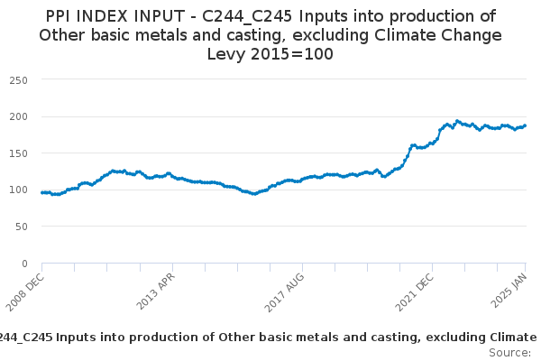 Download this time seriesPPI INDEX INPUT - C244_C245 Inputs into production of Other basic metals and casting, excluding Climate Change Levy 2015=100