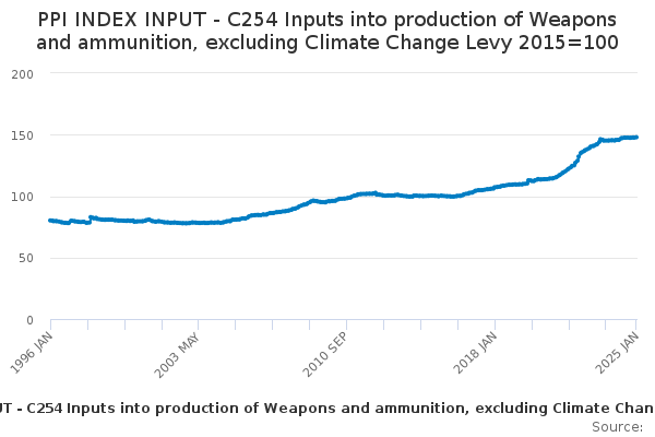Download this time seriesPPI INDEX INPUT - C254 Inputs into production of Weapons and ammunition, excluding Climate Change Levy 2015=100