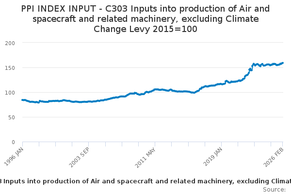 Download this time seriesPPI INDEX INPUT - C303 Inputs into production of Air and spacecraft and related machinery, excluding Climate Change Levy 2015=100