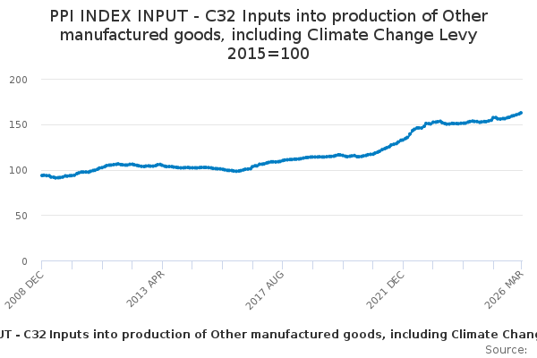 Download this time seriesPPI INDEX INPUT - C32 Inputs into production of Other manufactured goods, including Climate Change Levy 2015=100