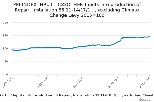 Download this time seriesPPI INDEX INPUT - C33OTHER Inputs into production of Repair; Installation 33.11-14/17/1..., excluding Climate Change Levy 2015=100