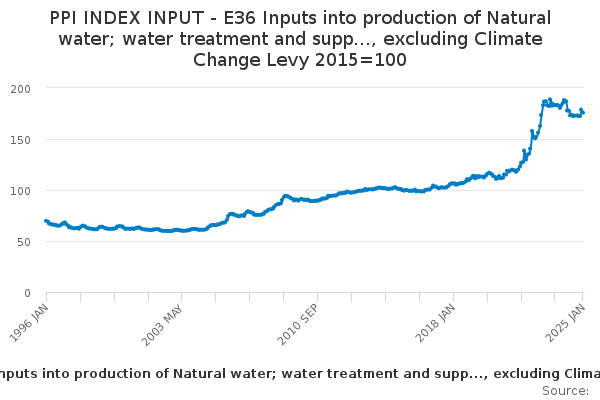 Download this time seriesPPI INDEX INPUT - E36 Inputs into production of Natural water; water treatment and supp..., excluding Climate Change Levy 2015=100