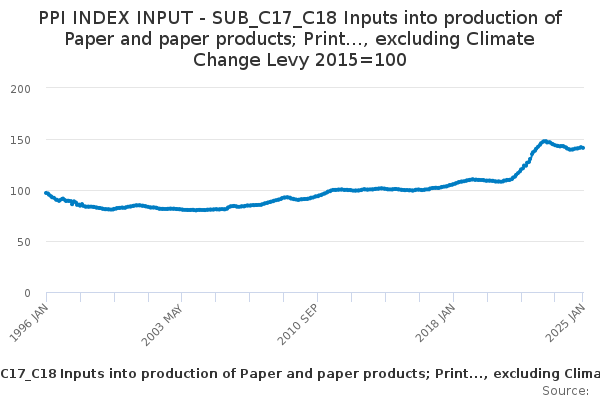 Download this time seriesPPI INDEX INPUT - SUB_C17_C18 Inputs into production of Paper and paper products; Print..., excluding Climate Change Levy 2015=100