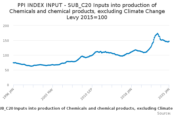 Download this time seriesPPI INDEX INPUT - SUB_C20 Inputs into production of Chemicals and chemical products, excluding Climate Change Levy 2015=100