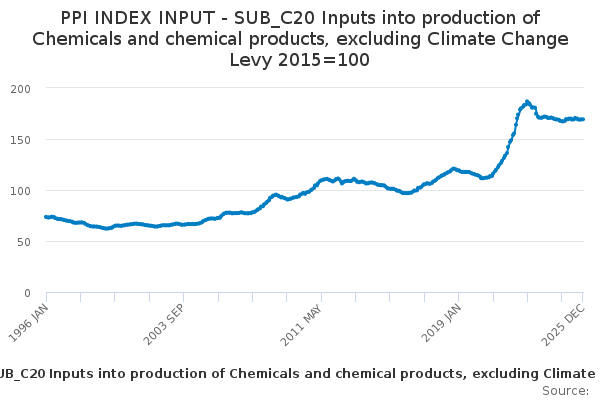 Download this time seriesPPI INDEX INPUT - SUB_C20 Inputs into production of Chemicals and chemical products, excluding Climate Change Levy 2015=100